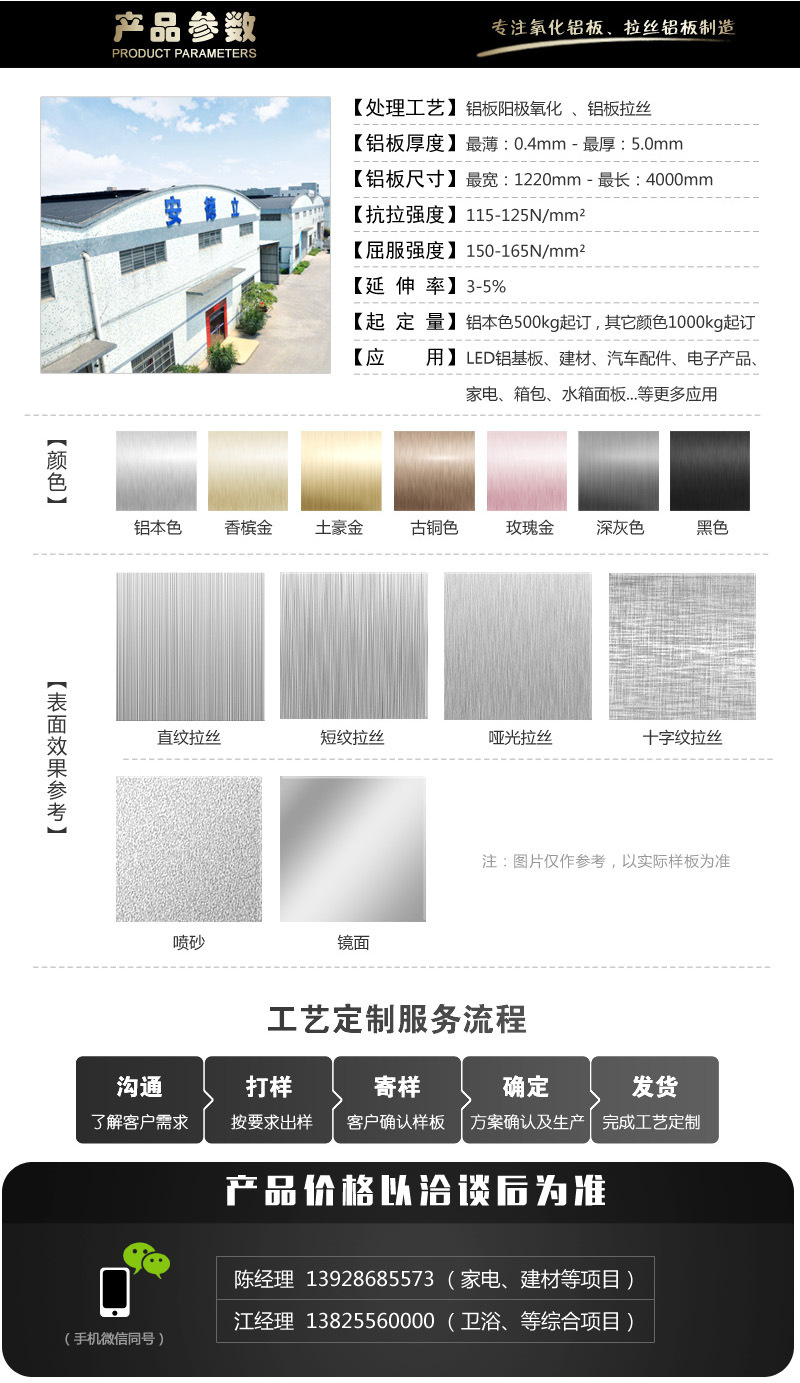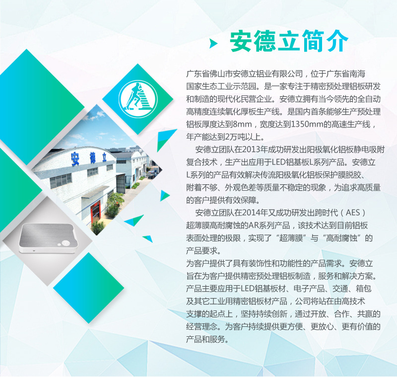 广东省佛山市安德立铝业有限公司,位于广东省南海国家生态工业示范园。是一家专注于精密预处理铝板研发和制造的现代化民营企业。安德立拥有当今领先的四条全自动高精度连续氧化厚板生产线。是国内能够生产预处理铝板厚度达到8mm,宽度达到1350mm的高速生产线,年产能达到2万吨以上。 安德立团队在2013年成功研发出阳极氧化铝板静电吸附复合技术,生产出应用于LED铝基板L系列产品。安德立L系列的产品有效解决传流阳极氧化铝板保护膜脱胶、附着不够、外观色差等质量不稳定的现象,为追求高质量的客户提供有效保障。 安德立团队在2014年又成功研发出跨时代(AES)超薄膜高耐腐蚀的AR系列产品,该技术达到目前铝板表面处理的极限,实现了“超薄膜”与“高耐腐蚀”的产品要求。为客户提供了具有装饰性和功能性的产品需求。 安德立旨在为客户提供精密预处理铝板制造,服务和解决方案。产品主要应用于LED铝基板材、汽车、电子产品、交通、箱包及其它工业用精密铝板材产品,公司将站在由高技术支撑的起点上,坚持持续创新,通过开放、合作、共赢的经营理念。为客户持续提供更方便、更放心、更有价值的产品和服务。